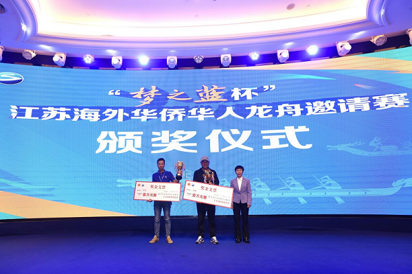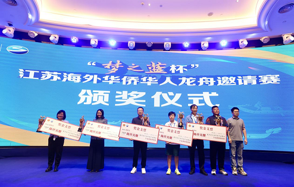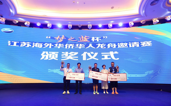 经过两轮激烈角逐,最终欧洲华侨华人社团二队龙舟队斩获一等奖,阿根廷龙舟协会龙舟队、南京青年大学生龙舟队获二等奖,加拿大江苏华人联合总会龙舟队、马来西亚冒险龙龙舟队、欧洲华侨华人社团一队龙舟队获三等奖,剩余六支参赛队伍均荣获优胜奖。比赛组委会为获奖龙舟队举行了颁奖仪式。