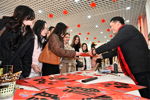 书法老师现场挥毫,为大家书写满载新春祝福的 “福” 字。不少留学生兴致盎然地亲手提笔,一笔一划认真临摹;还有同学请老师写下自己的名字和新春寄语,把专属的新春祝福珍藏起来。