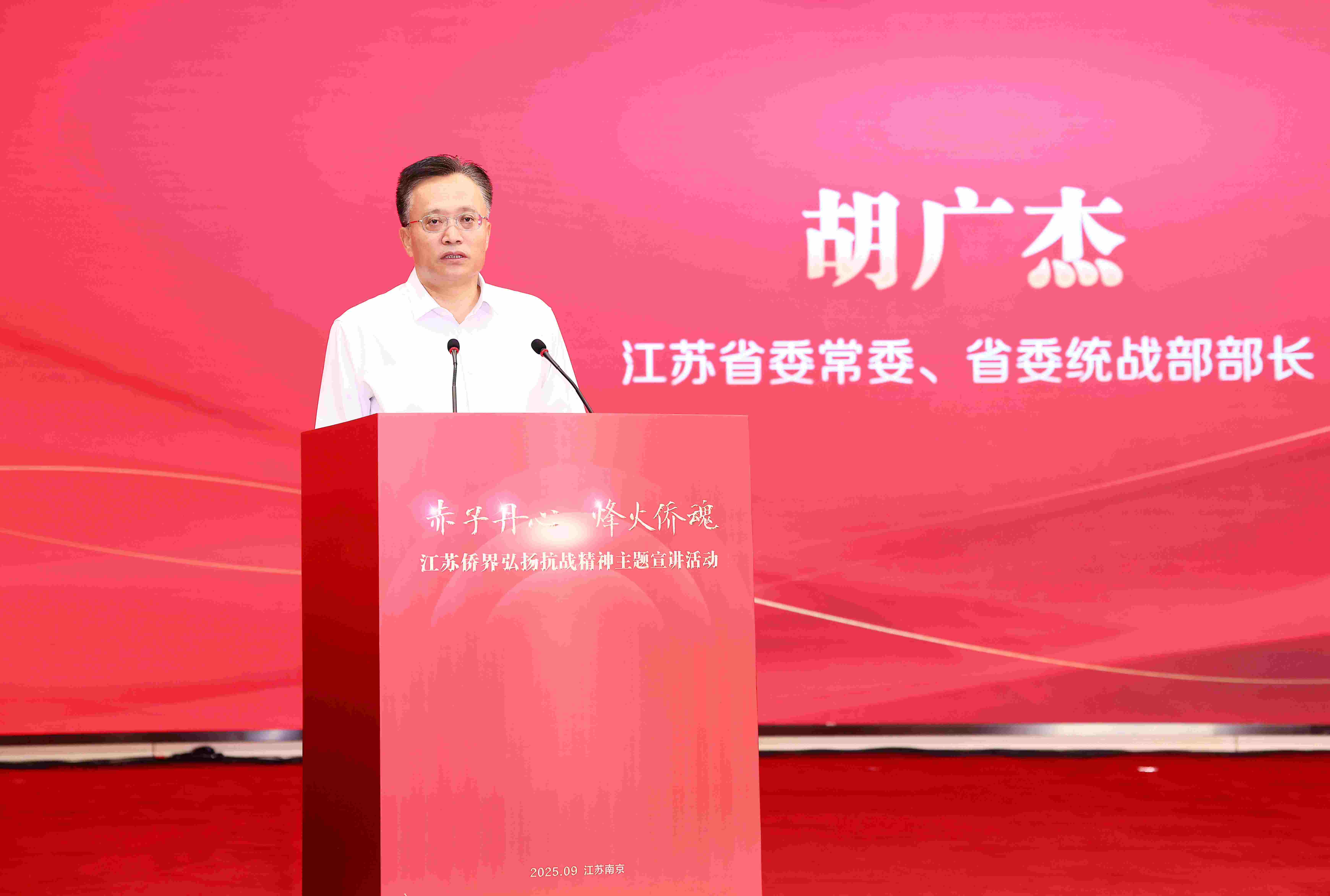 胡广杰在致辞中深切缅怀了所有为抗战胜利作出卓越贡献与英勇牺牲的抗日英烈、海内外同胞和国际友人。他表示,抗战期间,江苏人民和全国人民一道,在中国共产党倡导建立的抗日民族统一战线旗帜下,万众一心,共御外侮;广大侨胞始终心系祖国,以空前的民族觉醒和巨大的牺牲奉献,在中华民族抗战史册上书写了壮丽篇章。他指出,习近平总书记在纪念中国人民抗日战争暨世界反法西斯战争胜利80周年大会上发表的重要讲话,为我们在新征程上大力弘扬伟大抗战精神、加快实现中华民族伟大复兴的中国梦指明了前进方向。他希望广大归侨侨眷和海外侨胞,要传承嘉庚精神、凝聚奋进力量,发挥独特优势、服务中心大局,讲好中国故事、传播好江苏声音,加强团结协作、发挥侨界合力,为中国式现代化江苏新实践、为中华民族复兴伟业贡献侨界力量。
