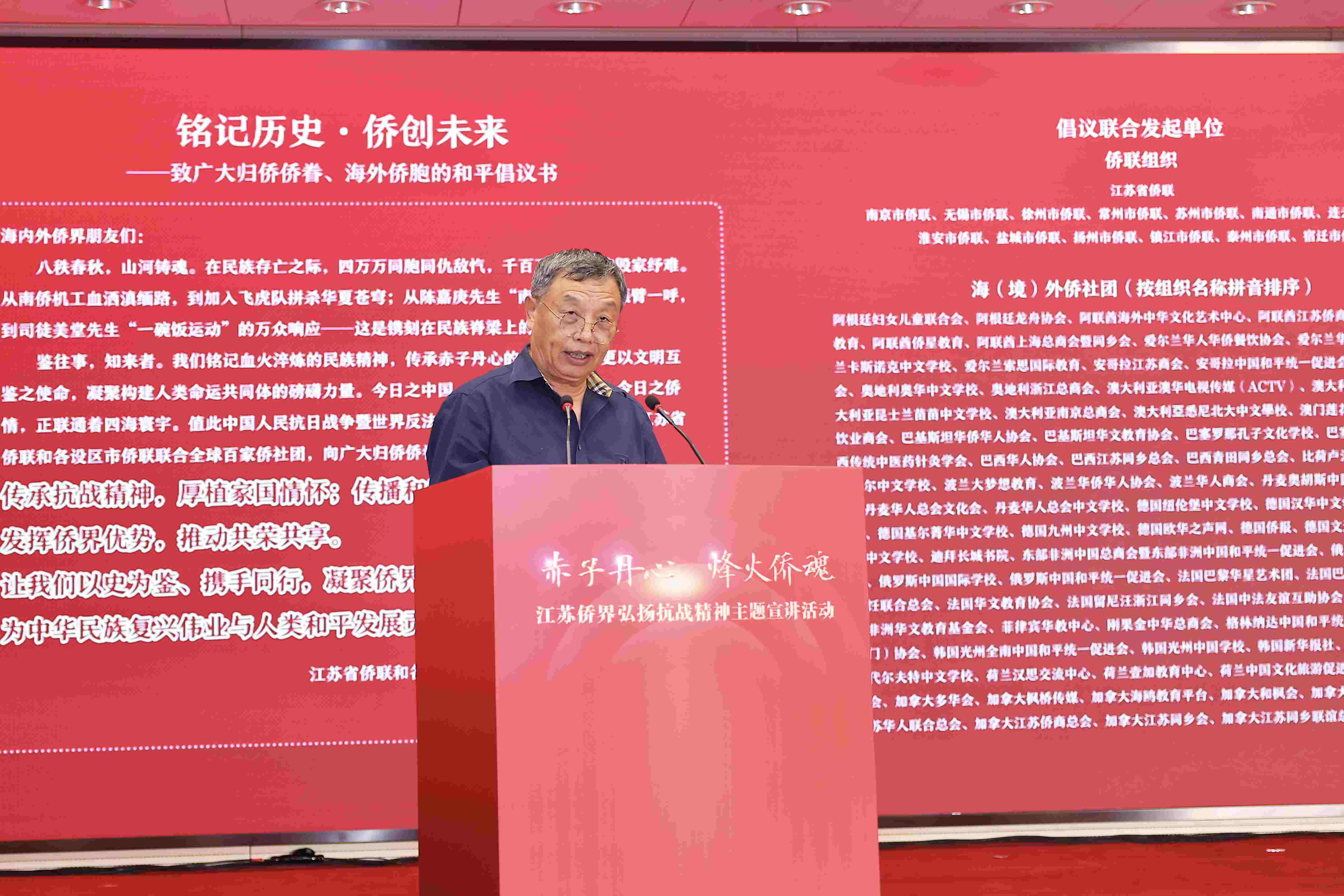 9月4日,由江苏省侨联、江苏省侨办联合主办的“赤子丹心•烽火侨魂”江苏侨界弘扬抗战精神主题宣讲活动在南京举办。省委常委、省委统战部部长胡广杰出席活动并致辞,省委统战部、省外办、省侨办、省侨联、新华日报社、南京市委统战部、南京市侨联、中山陵园管理局等相关部门负责同志,以及陈纳德将军外孙女嘉兰惠等抗战老兵后人、海外侨领和归侨侨眷代表约200人现场出席。省侨联主席、党组书记刘标主持。活动还在宁外12个设区市侨联设置了分会场,并向全球直播,在线播放量近百万。