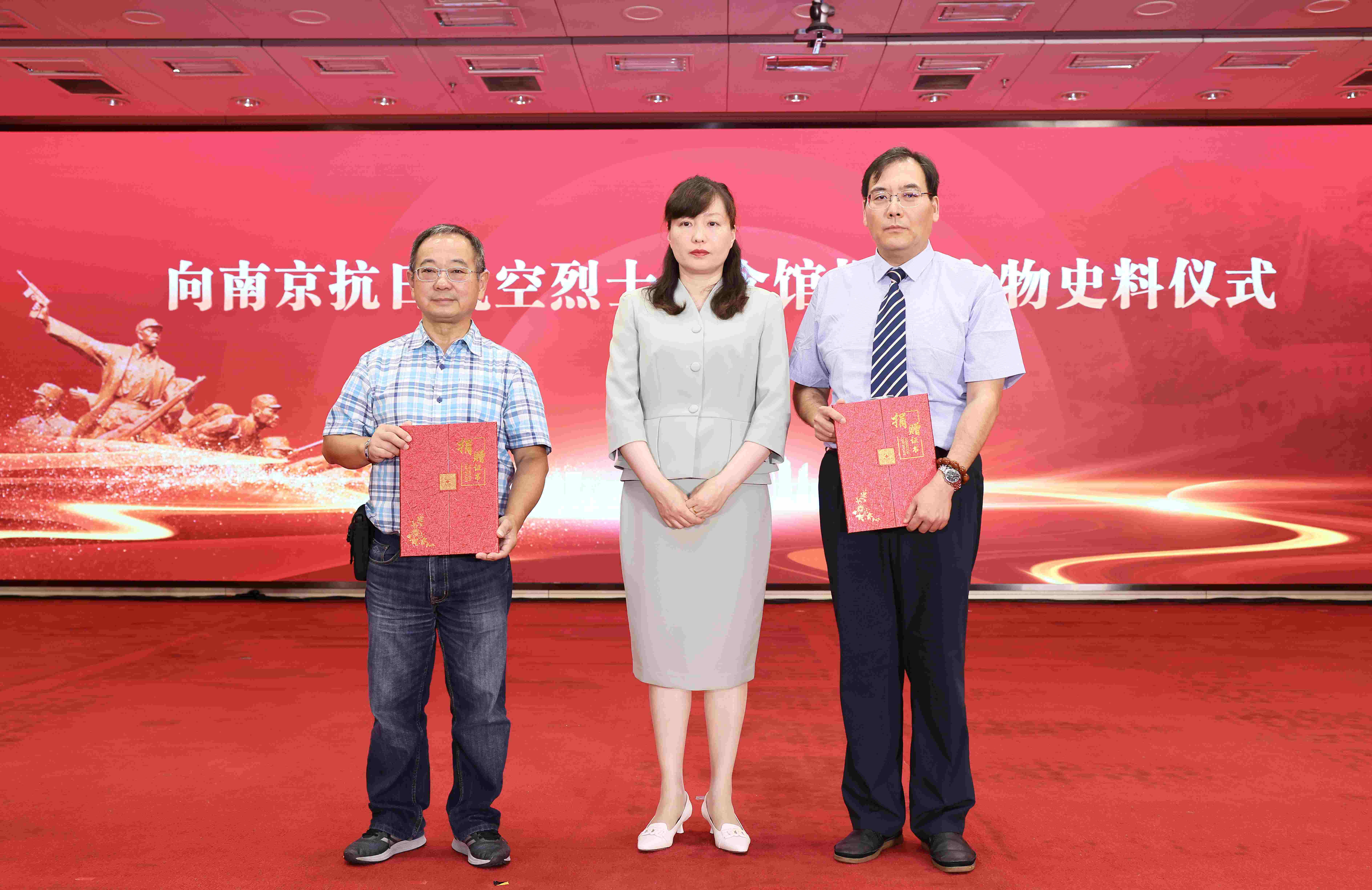 抗战史料捐赠人、美籍华人鲁照宁,中美混合飞行团队员、抗日航空英烈陈端纮侄孙陈钢两位爱心人士,向南京抗日航空烈士纪念馆捐赠了文物史料。之后8位侨界代表人士和抗战老兵后人代表上台放飞了和平鸽。