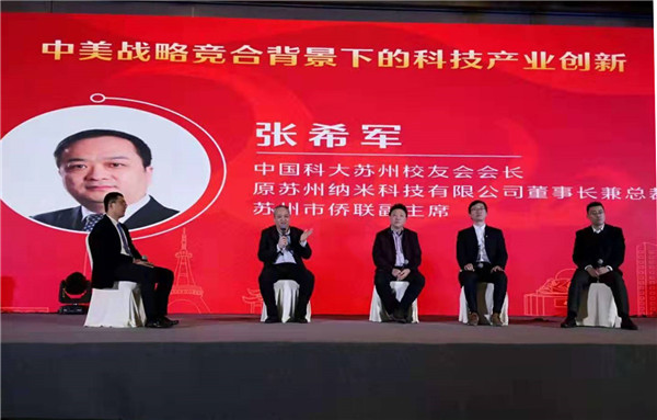 中国科大苏州校友会会长、苏州市侨联副主席张希军主持活动,并作为圆桌论坛嘉宾之一,围绕“中美战略竞合背景下的科技产业创新”话题,分享了自己的见解。