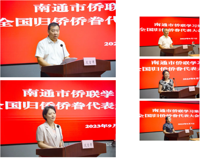 第十一次全国归侨侨眷代表大会海外代表成富强、代表刘冬梅,“全国侨联系统先进组织”海安市侨联主席景圣余,“全国归侨侨眷先进个人”代表李小萍,“全国侨联系统先进个人”葛燕作交流发言。