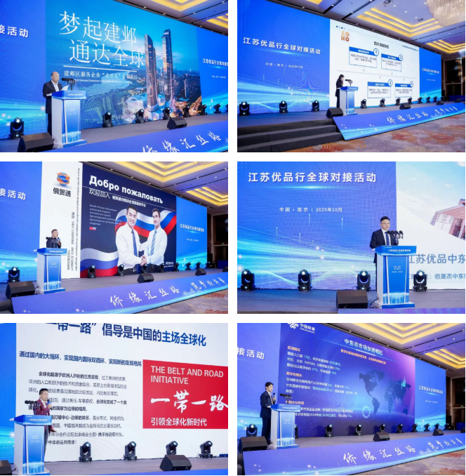 江苏苏豪亚欧互联科技集团有限公司丝路电商部经理杨子婷推介的“中国-中亚贸易畅通合作平台”,整合五大功能中心及霍尔果斯、阿拉木图仓储资源,通过常态化展会、电商联动与技术交流,助力江苏企业深耕中亚市场;俄罗斯对中国“一带一路”投资联合会中国大区主席赵宜群详解“俄贸通对俄综合贸易服务平台”,以数字化手段破解中俄贸易中存在的对接效率低、结算风险高、合规门槛高等难题;佰晟杰中东钢铁有限公司CEO强杰分享了江苏优品拓展中东市场的机遇,依托中阿产能示范园的政策与区位优势,推动建材、钢结构等产品精准对接阿联酋市场;乌干达深圳总商会执行会长程文术以天唐工业园为载体,分享“海外侨商产业园助力中非合作”的实践,为江苏轻工、农业机械等企业进入非洲提供落地平台;中国联通江苏省公司国际业务中心总经理刘涛从“数智化加速优品出海”角度,提出以数字化手段为企业全球布局全链路提速,让“江苏制造”在全球市场更具竞争力。