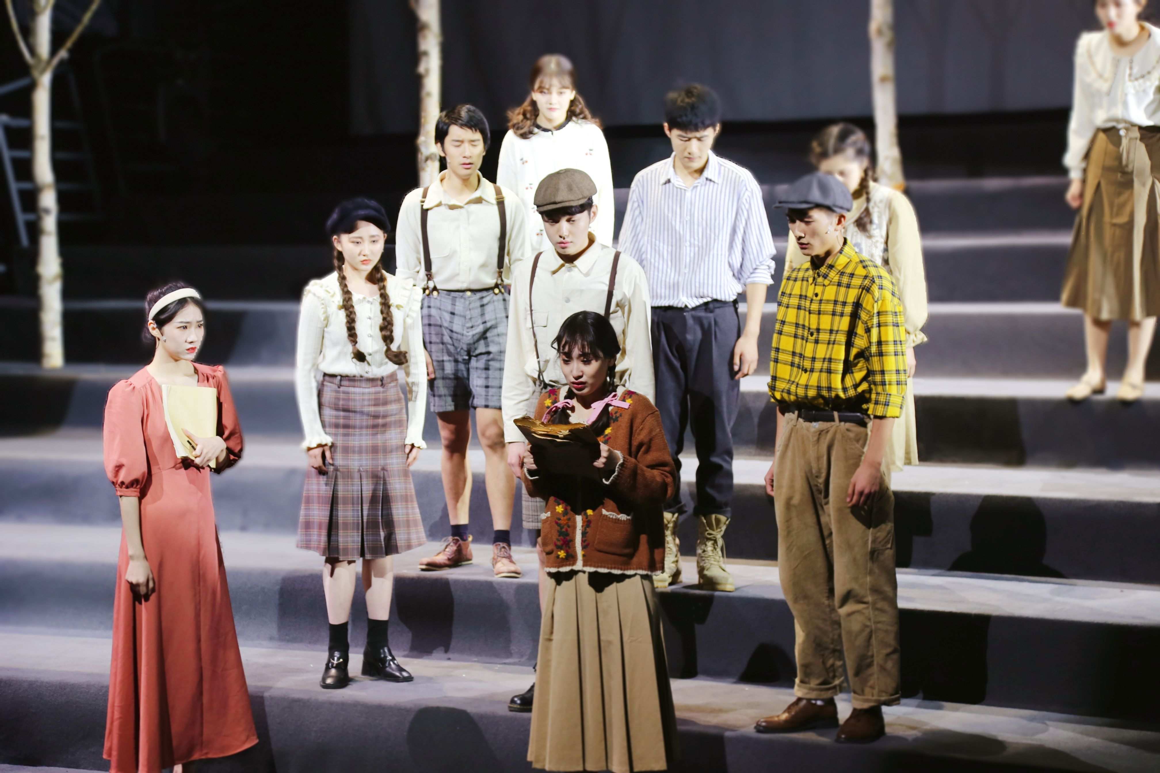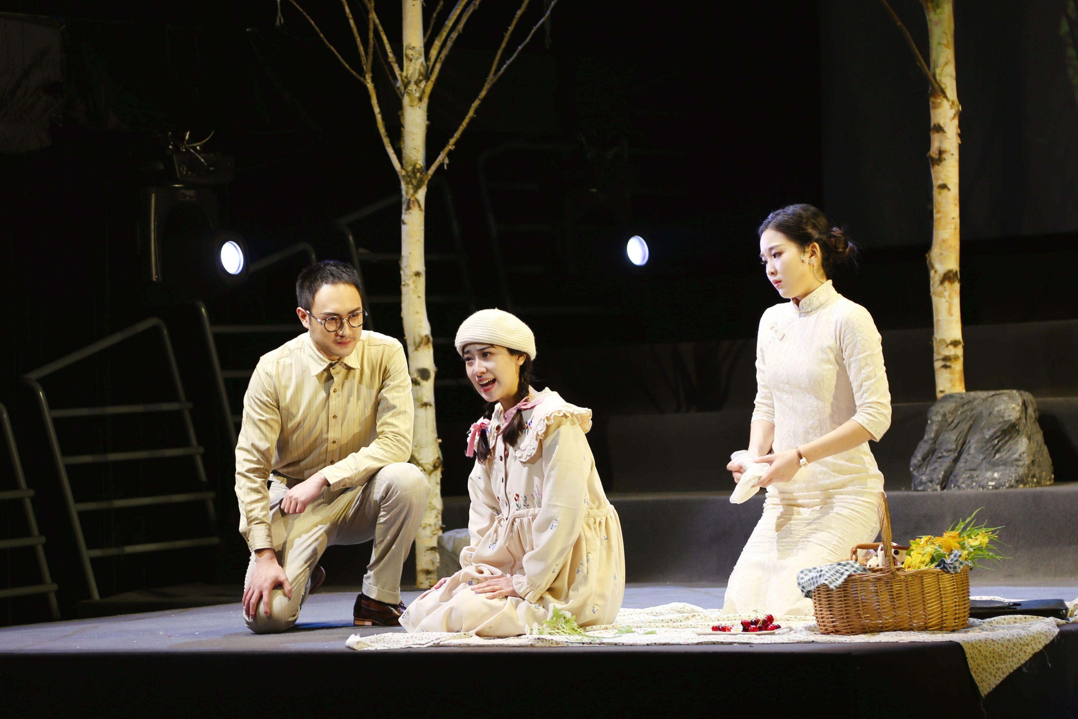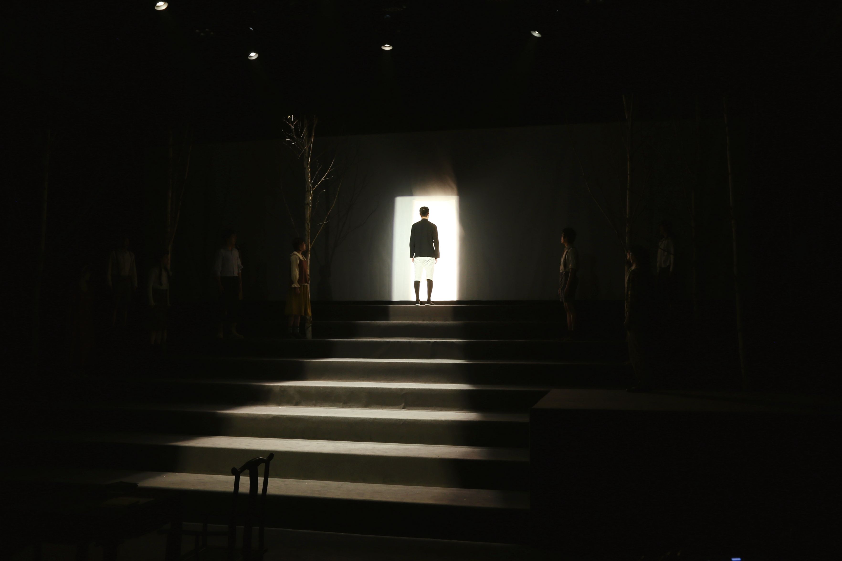 阶梯状的舞台、铺满落叶的座椅、如梦如幻的光影……演出在沉浸式的场景体验中缓缓铺开——
