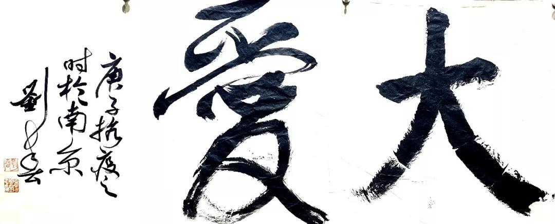 在此全国抗疫之时,特仿唐代颜真卿的楷、行体分别榜书"大爱"二字。借颜真卿刚正不阿、忠烈为国的精神品格来赞美、颂扬在家国危难之时那些生能舍己、挺身逆行的医护者和所有奉献中华民族的大爱精神。——刘春