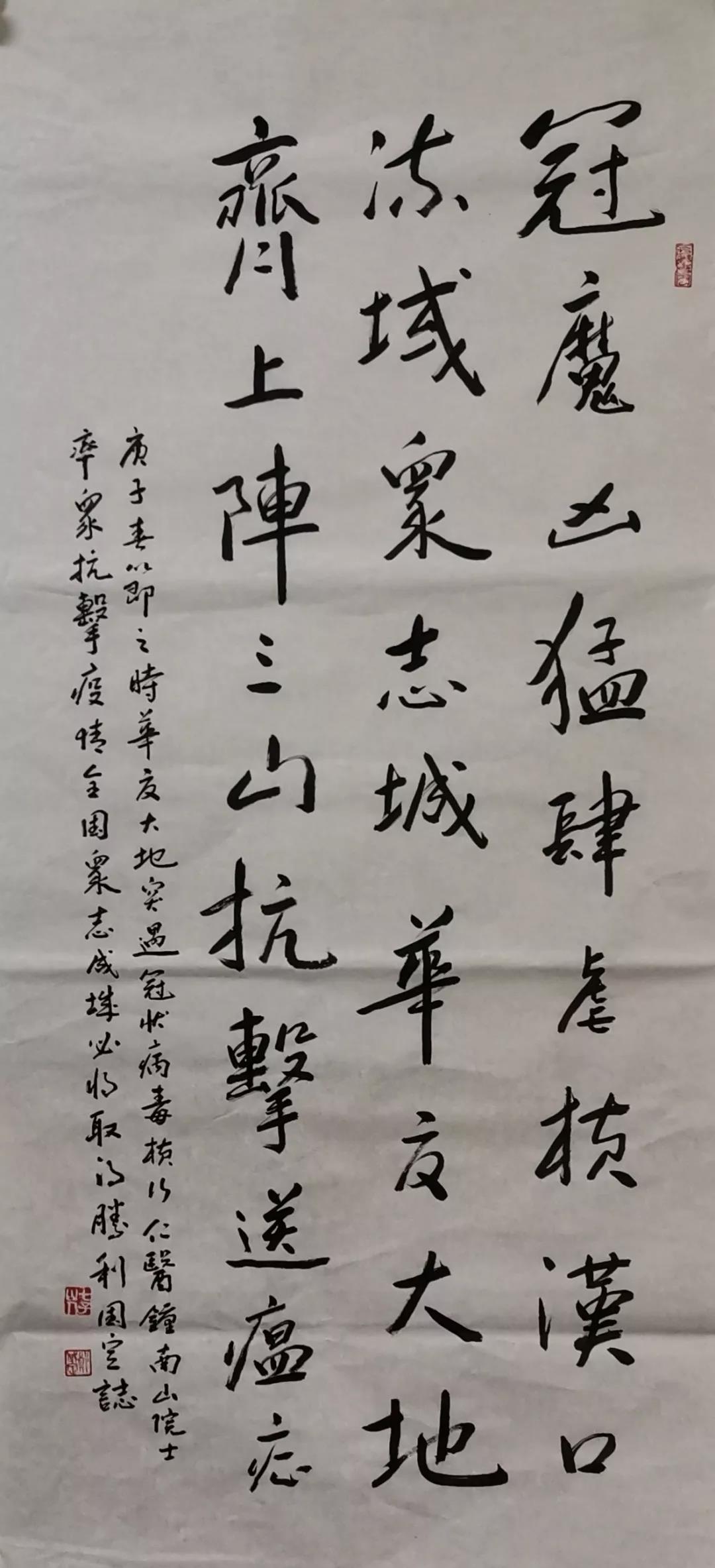 新冠将国人推向死亡,让国人恐慌。是谁把病人从死亡线上拉回来?是谁给予病人无微不至的关怀?是我们的白衣天使!书此联赞美抗击新冠的白衣天使,最美逆行者们!——陈红兵