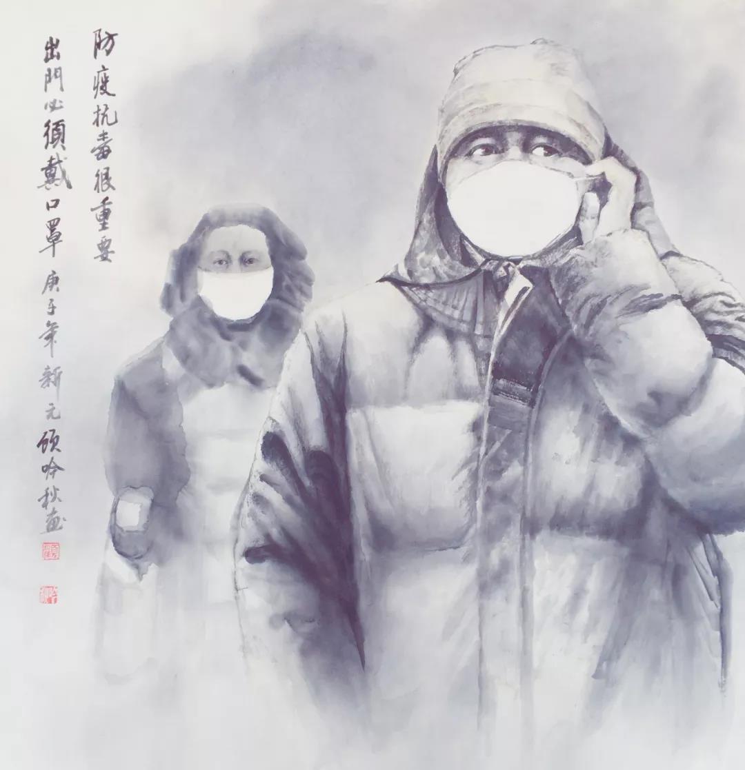 顾吟秋中国画 《防疫抗毒很重要 出门必须戴口罩》