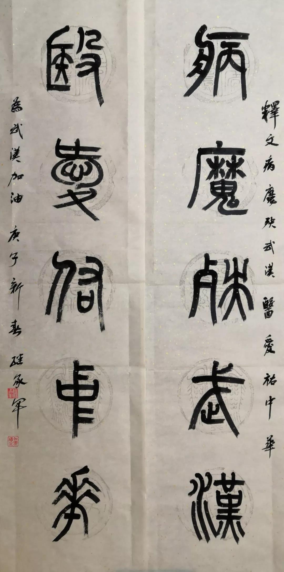 释文:火神山,雷神山,钟南山,三山镇毒。医者心,仁者心,中国心,万心抗疫。