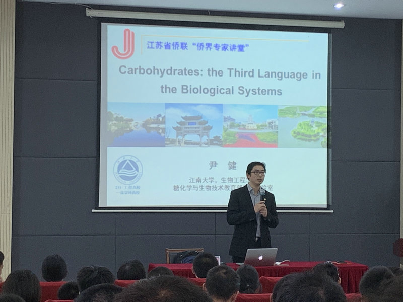 自2017年省侨联“侨界专家讲堂”活动开展以来,得到了侨界专家的大力支持和积极响应,受到广大侨界群众和社会各界的一致好评,取得了良好的社会效应。今天的主讲教授尹健博士毕业于德国波茨坦大学,回国前工作于德国马克斯-普朗克研究所,现为江南大学生物工程学院教授、博士生导师,副院长;长期从事“糖化学生物学”的研究,通过整合化学和酶法,制备具有重要生物学意义的寡/多糖和各种糖骨架分子,并进行生物学应用研究;主持国家自然科学基金等省部级项目10余项,近五年以通讯作者形式在Journal of the American Chemical Society和Advanced Functional Materials等期刊发表论文20余篇,荣获中国侨联和国务院侨务办公室颁发的“全国归侨侨眷先进个人”。
