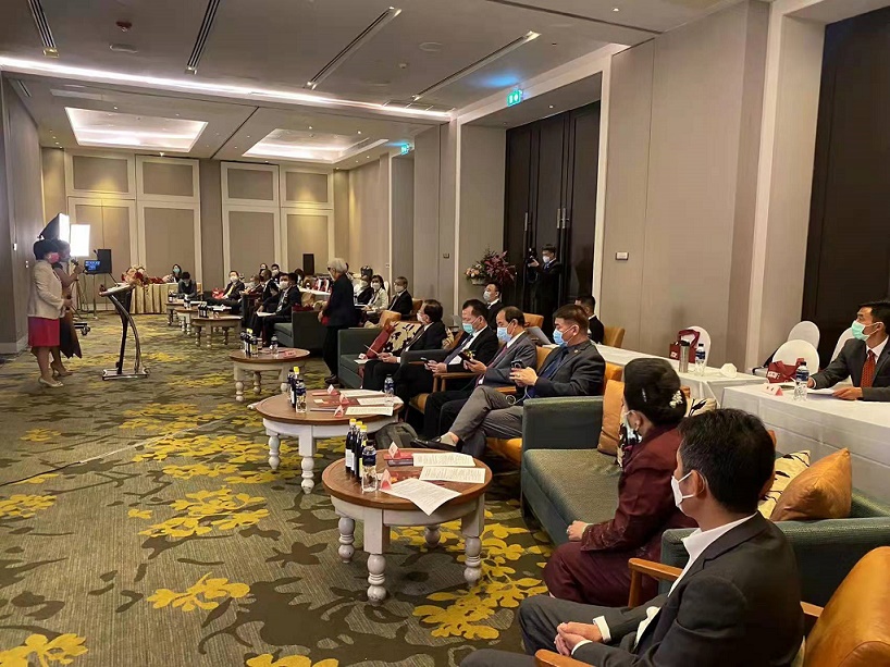 这场由泰国江苏商会、镇江市侨联、镇江市旅游协会、江苏大学文学院(语言文化中心)、江苏恒顺醋业股份有限公司联合主办的“认识江苏——走进中国醋都镇江”恒顺醋业线上推介会分别在江苏省华侨文化交流基地——镇江中国醋文化博物馆和曼谷 Radisson Blu Plaza Bangkok 三楼贵宾厅连线举行。泰国中华总商会李桂雄副主席、泰国江浙会馆张德仁理事长、泰国友好基金会林嘉南主席,以及泰国广西总会、泰国安防协会、泰国上海商会等20多家泰国侨界商会的主席(会长)参加了这一活动。