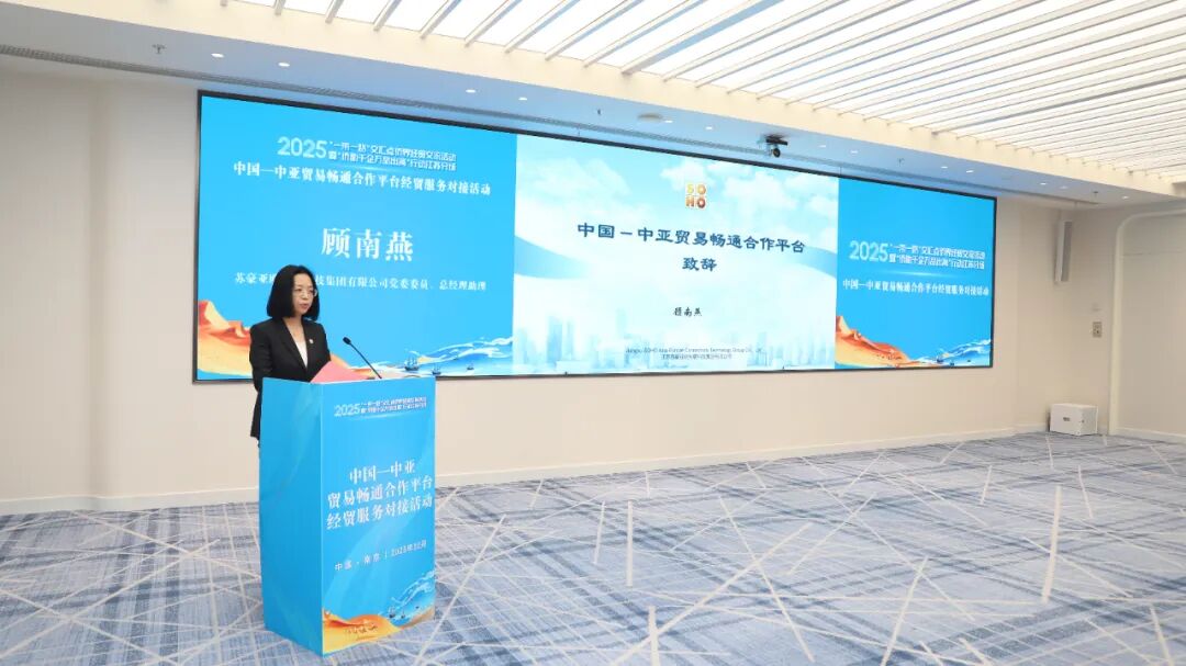 顾南燕代表苏豪亚欧互联科技集团致辞,重点介绍了集团在促进中国与中亚互联互通方面的战略布局与平台服务优势。
