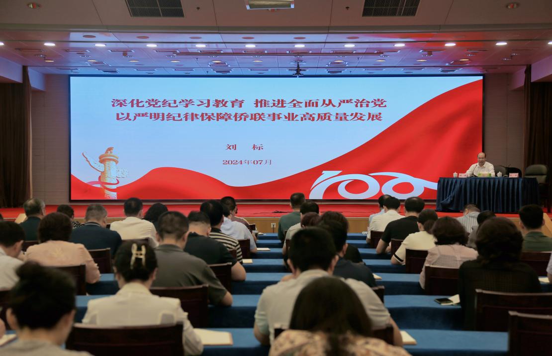 为庆祝中国共产党成立103周年,深入推进党纪学习教育走深走实,激励全体党员干部坚定理想信念、砥砺初心使命、勇于担当作为,近日,省侨联举行“两优一先”表彰暨党纪学习教育专题党课,党组书记、主席刘标以《深化党纪学习教育 推进全面从严治党 以严明纪律保障侨联事业高质量发展》为题为全体党员讲授党纪学习教育专题党课。机关全体党员干部职工参加会议。