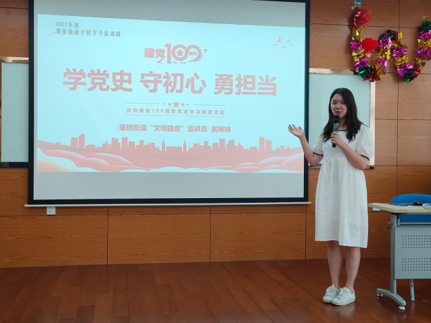 为庆祝中国共产党成立100周年,传承弘扬中华民族优秀传统文化,实现知史爱党,知史爱国,激励社区侨界人士坚定“永远跟党走”的信念,堰新社区侨之家积极组织开展党史学习教育,街道文明强音宣讲团成员为社区侨眷上了一堂《学党史 守初心 勇担当》红色党课。宣讲员通过党史发展脉络及学习意义、100年艰辛与辉煌、100年伟大精神三个方面,让社区侨眷们充分了解中国革命和发展道路的漫长与艰辛,体会幸福美好生活的来之不易,大家纷纷表示将把满腔爱国热情化为强大动力,积极投身到社区各项工作中。